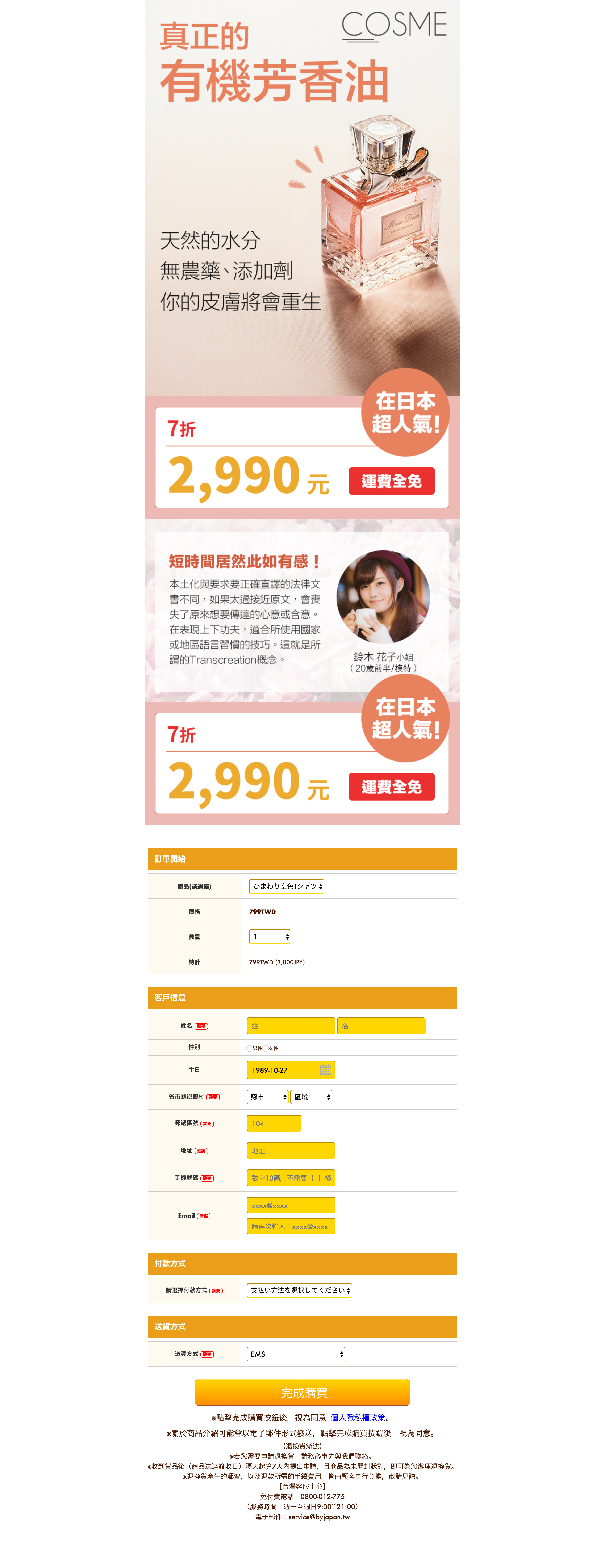 一方で、単品通販タイプというのはその名の通り、1つの商品のみを販売するECサイトになります。縦長のランディングページを用いてじっくり商品説明をするサイトが一般的です。LPの最後に購入フォームを設けて、他ページに遷移することなく一つのLPで決済完了することが可能です。