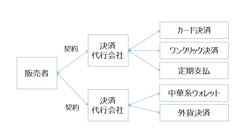 上の図のように、クレジットカードを取りまとめる決済代行会社と、中華系の決済を取りまとめる決済代行会社の2社と契約する場合もあります。