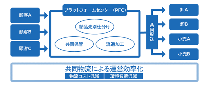 業界ごとに情報システム、物流センター、配送網などの標準インフラ(プラットフォーム)を構築し、同一業界のお客様に共同保管・共同配送などの共同物流サービス。