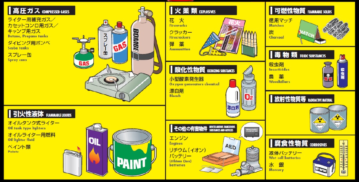 航空法では以下のような爆発の恐れのあるもの、燃えやすいもの、その他人に危害を与え、または他の物件を損傷する恐れのあるものを「危険物」とし、航空機による輸送を禁止しています。