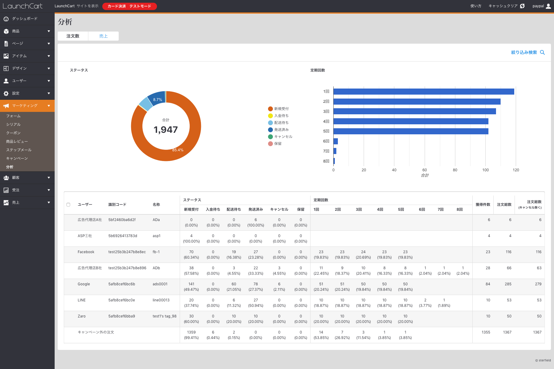 どの媒体、ユーザーからの流入、継続率、キャンセル率が多いかなどがひと目で分かります。