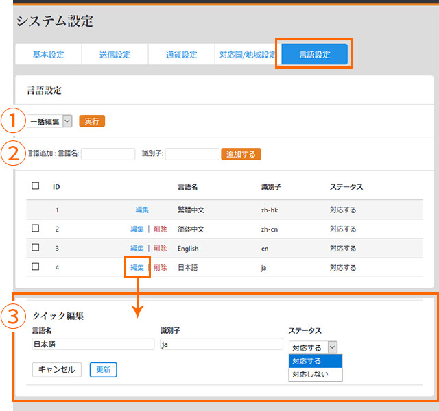 編集クリックでクイック編集が開きます。言語名、識別子、ステータスの変更が可能です。ステータスは対応なしで言語のセレクトボックスに表示されません。