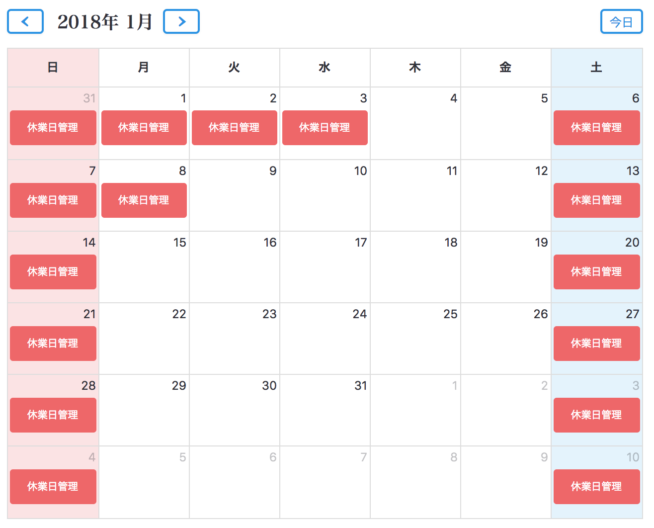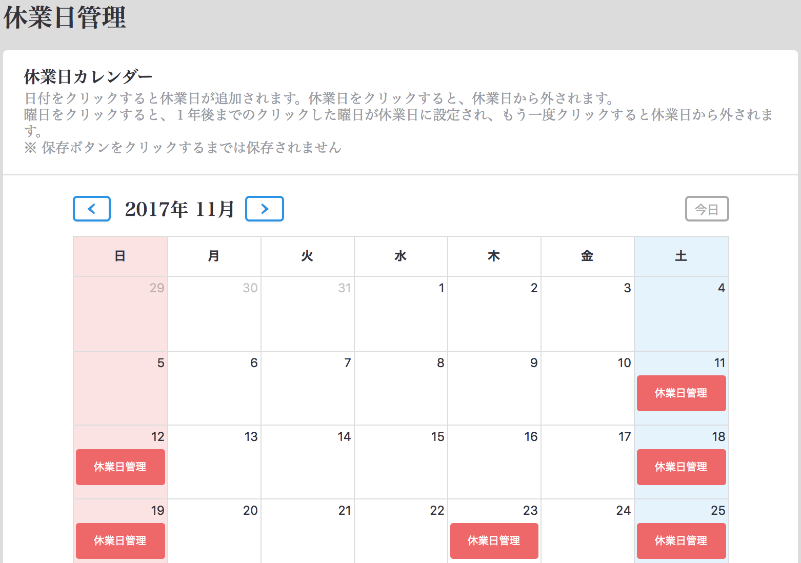 ここまでの流れの設定として、まずは休業日の登録を行う必要があります。