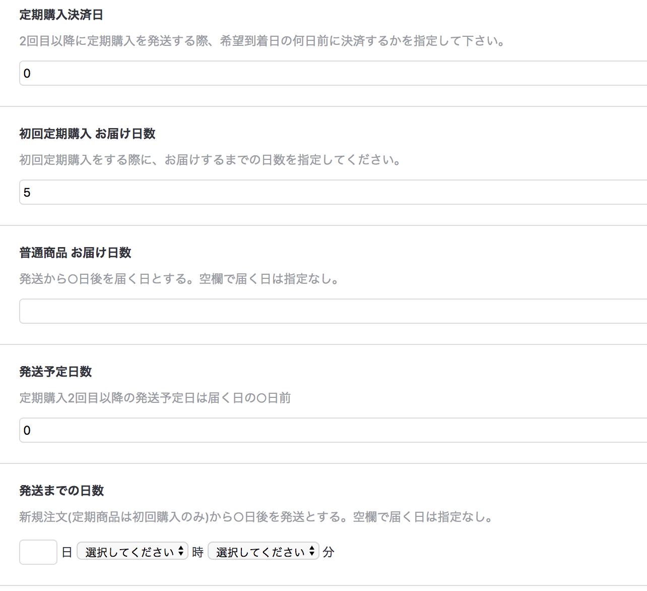 つづいて「初回定期購入 お届け日数」と「一般商品 お届け日数」設定します。