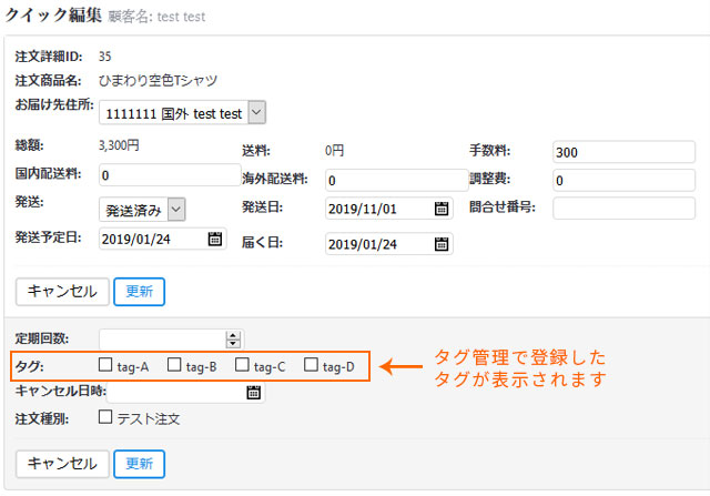 クリックで以下のようなフォームが開きます。注意点として、配送先が複 数の場合や、購入した商品が異なる配送方法だった場合、配送が別になり ます。この場合は以下のように別配送の件数分注文が表示されます