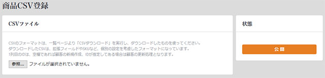 新規で商品を登録したい場合、このCSVをまずはダウンロードし、内容を変更してからアップロードしてください。