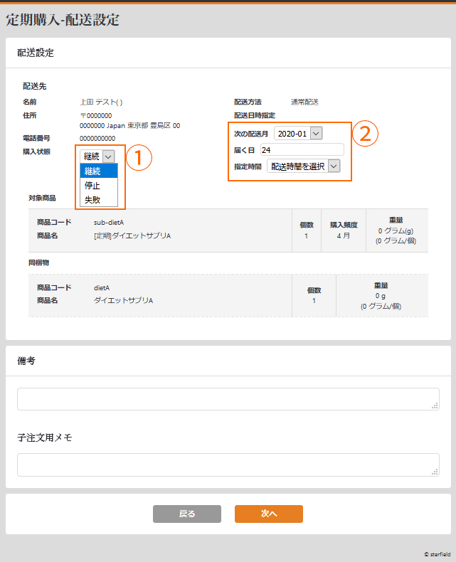 次の配送月、届く日、指定時間 をそれぞれ選択・入力します。
