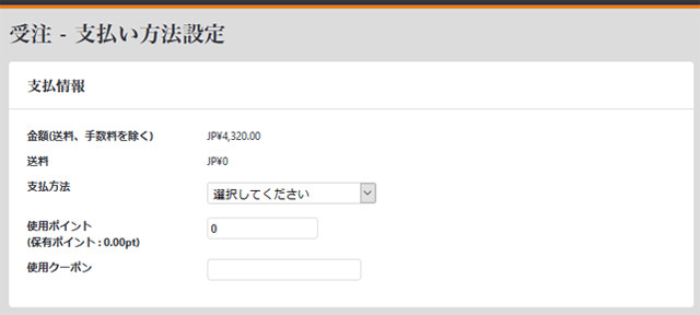 注文に対する支払方法、使用ポイント、使用クーポンを指定する画面です。