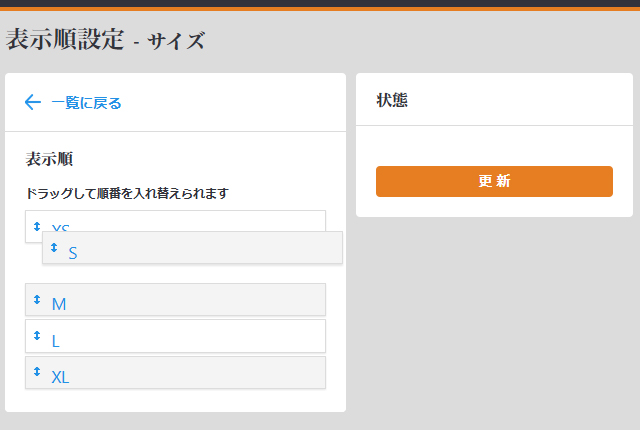 サイズやカラーなどの順番をドラッグアンドドロップで変更できます。