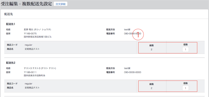 該当の顧客の全ての配送先が表示され、どの商品をどこにいくつ送るかを指定します